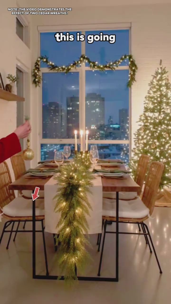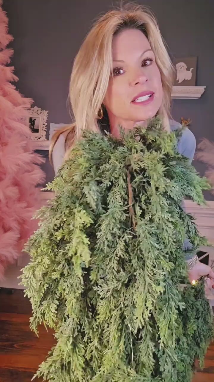 Transform your space in minutes. The Pre-Lit Real-Touch Cedar Garland™ brings the natural beauty of fresh-cut cedar and the glow of warm, golden lights all without the mess, drying, or tangles of real greenery.Each strand is hand-crafted with hundreds of soft cedar tips and micro LED lights woven throughout to create the perfect cozy holiday atmosphere.Technical DetailsLength: 9 ft (270 cm / 106.3 in Measured end-to-end, including loops Lighting: 80 warm-white LED micro lights woven throughout for even illumination Power: 3 × AA batteries (not included)Timer Function: Automatic 6-hour ON / 18-hour OFF cycle for effortless daily glow Material: Premium real-touch cedar PE blend soft, full, and naturally draping Use: Safe for indoor and covered outdoor spaces